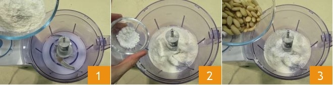 To prepare the 5-minute muffins, pour the all-purpose flour 1 and baking powder 2 into the bowl of a mixer fitted with blades. Also add the almonds 3,
