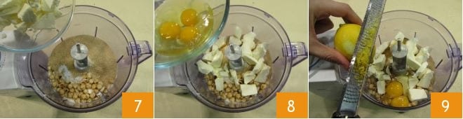 Finally, add the diced butter 7, the 3 eggs 8, and the grated zest of one lemon 9, taking only the yellow part.