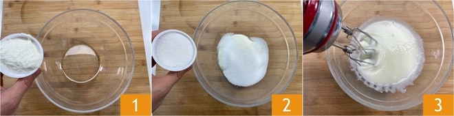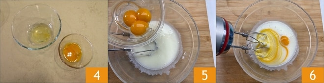 At this point, break the eggs and separate the whites and yolks into two separate bowls 4, then using the beater again, add the yolks to the yogurt and sugar mixture 5 until they are incorporated 6.
