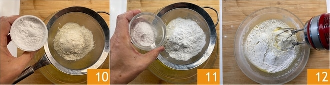 the jar of cornstarch 10, and finally the packet of baking powder 11. Sift everything and still using the beater on low speed 12 incorporate the powders,