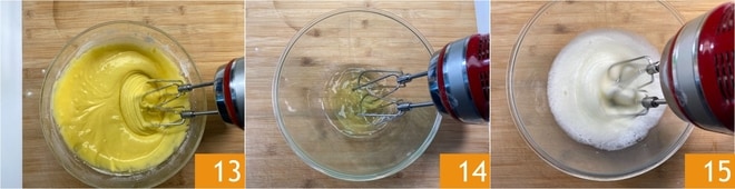 until you get a smooth and uniform mixture 13. At this point, take the egg whites and beat them until stiff using clean and dry whisks 1415.