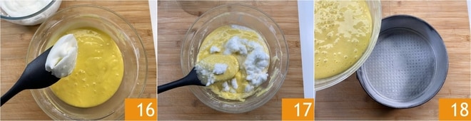 Add them to your mixture in two or three stages: start by adding a small amount of egg whites and mix vigorously without fear of deflating the batter 16, then gently fold in the rest of the egg whites with rotational movements from bottom to top to avoid deflating the mixture 17. Once your cake batter is ready, butter and flour a 9-inch round mold (preferably springform); then pour the batter into it 18.
