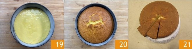 At this point 19, bake the 7 jar cake in a preheated static oven at 356°F for 50 minutes on the lower-middle rack; if the cake darkens on the surface, cover it with aluminum foil during the last 10 minutes of baking. You can check the cooking by inserting a skewer; once cooked, take it out of the oven 20 and let it cool slightly before removing it from the mold and serving it 21.