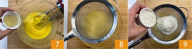 While keeping the beater on, also add the oil in a stream 7. Once it is well combined, place a sieve directly over the bowl 8, pour in the two jars of flour 9,