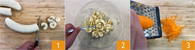 To make the banana and carrot pancakes, first peel the bananas and slice them, then mash 240 grams (about 8.5 oz) of pulp with a fork 1. Trim and peel the carrots, then finely grate 180 grams (about 6.5 oz) of pulp 3.