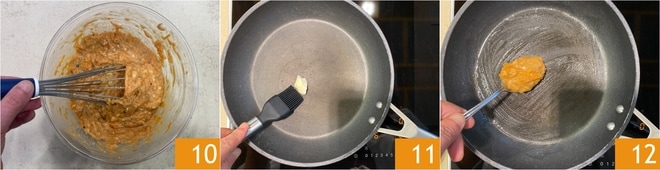 Mix with a whisk to combine everything and obtain a homogeneous mixture 10. Proceed to cooking: lightly grease a pan with butter 11 and pour a ladle of batter for each pancake 12.