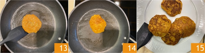 Cook over medium heat for 2-3 minutes, then flip it to the other side 13 and cook for another 2-3 minutes 14. As they are cooked, remove the pancakes from the pan 15 and continue until the batter is used up.