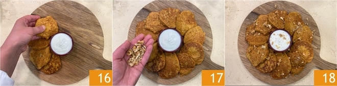 Plate the pancakes 16 and garnish with walnut crumbs as desired 17. Your banana and carrot pancakes are ready to be served with yogurt 18!