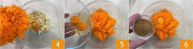 Pour the grated carrots into the bowl with the mashed bananas 4, then add the eggs 5 and the brown sugar 6.
