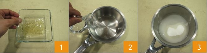 To prepare the marshmallows, start by soaking the gelatin sheets in about 3 oz of cold water for at least ten minutes 1. Meanwhile, pour 80 grams (about 2.8 oz) of water into a saucepan 2, and add the granulated sugar 3.