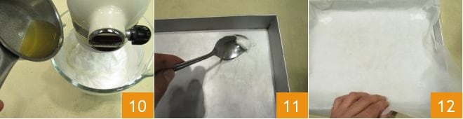 As soon as the gelatin is melted, pour it into the mixer bowl 10, turn the beaters back on and continue whipping the meringue until the mixture is completely cooled. In a rectangular baking sheet measuring 13x10 inches, pour a little meringue in the four corners of the pan 11 and then lay down a sheet of parchment paper. This will prevent the paper from moving 12.