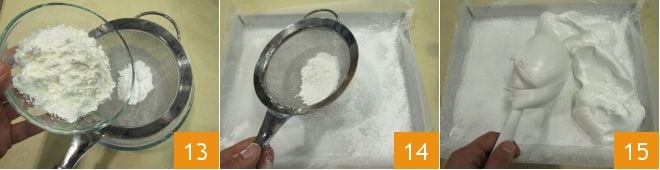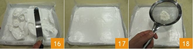 Level it carefully with a spatula 16, and on the now smooth base 17, sprinkle with more sugar and starch until the entire surface is covered 18. Let it rest at room temperature for 12 hours without covering.