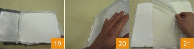 After the necessary time to settle the meringue, remove it from the pan 19 and flip it onto the work surface, using a hand to prevent it from breaking in the center 20. Then gently peel off the parchment paper 21.