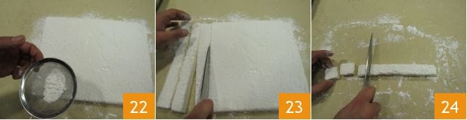 Dust again with the sifted powders (starch and powdered sugar) 22 and then cut into strips about 1 inch thick, using a sharp knife 23 or scissors if you prefer. Then cut into pieces about 1-1 1/2 inch 24, thus obtaining about 50 marshmallows.