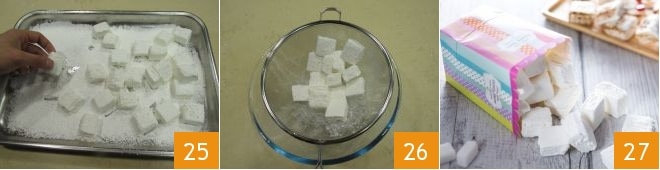 As you cut them, dip them into the remaining starch and powdered sugar mix 25, then shake off the excess powder by placing your pieces in a sieve 26. Your marshmallows are now ready to be enjoyed 27!