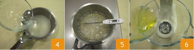 and then the glucose syrup 4. Place over heat and let it reach a temperature of 240°F, using a kitchen thermometer to verify 5. It will take a few minutes to reach the temperature, so in the meantime, also start whipping the egg whites until stiff peaks form, using a stand mixer 6, or an electric mixer if you don't have one.