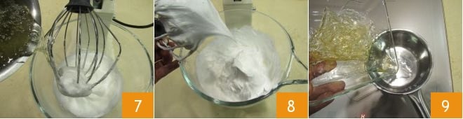 When the egg whites are whipped to stiff peaks and the syrup reaches 240°F, combine them by pouring the syrup into the mixer bowl 7 while the beaters are still running. Continue beating until the mixture forms threads, meaning when you remove the beaters, you don't see a curl detaching from the mass 8. Retrieve the gelatin, which by now will have absorbed the water, and pour it, without squeezing, into the saucepan, letting it melt over a very low flame 9.