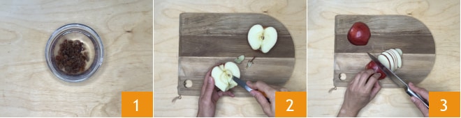 To prepare the skillet apples, first soak the raisins in warm water for 10 minutes 1. Wash the apples thoroughly under running water. Cut the apples in half and remove the core 2, then slice them thinly 3.