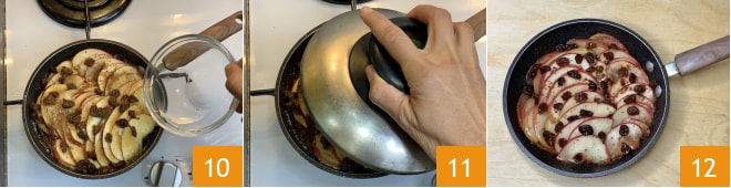 Cover with water 10 and cook for 10 minutes with the lid on 11. After this time, finish cooking without the lid for another 10 minutes to let the excess water evaporate. Let cool slightly and then serve the skillet apples 12.