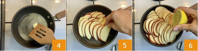 Melt a pat of butter in a small pan over low heat 4, lay the apple slices overlapping them 5. Squeeze the juice of half a lemon 6.