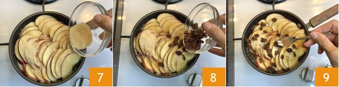 Add the brown sugar 7, the raisins 8, and a pinch of cinnamon 9.