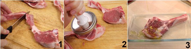 To prepare grilled lamb chops, first prepare the chops by removing any excess parts 1 and pounding the meat with a meat mallet 2. Place the chops in a baking dish, salt and pepper to taste on both sides, coat them with oil 3, and season with chopped garlic