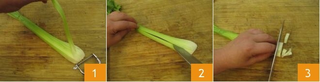 To prepare the acquasale, first wash all the vegetables; then focus on the celery. Use a peeler to remove the outer strings 1 and then split it in half lengthwise with a knife 2. Finally, cut it into strips about 1/4 inch thick 3.