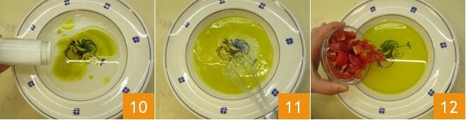 Add a pinch of salt 10 and emulsify everything with a whisk 11. Then add the cherry tomatoes 12,