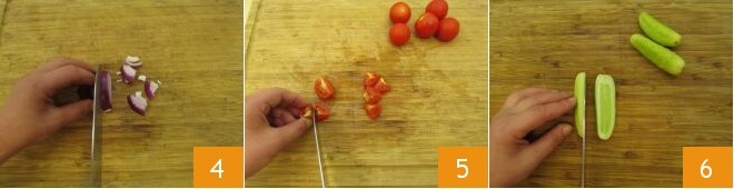 Move on to the onion, cutting it into strips of the same thickness 4 and set it aside. Take the cherry tomatoes and cut them into quarters, then cut each quarter in half to make 8 pieces from each cherry tomato. Lastly, work on the white cucumbers; there's no need to peel them; first, cut them in half lengthwise 6