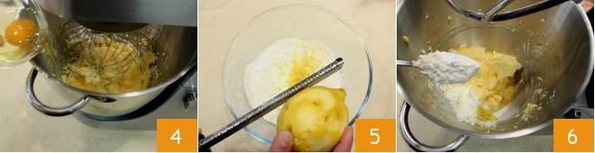 and when it is incorporated, add the whole egg 4 and let it incorporate. In a bowl, sift the flour, potato starch (or cornstarch), and grate the lemon zest 5. Then stop the mixer, add the powders to the mixture 6