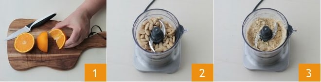 To make the almond and orange balls, first wash the orange and take a quarter 1. Meanwhile, place the blanched almonds in a blender 2 and blend them until they are powdered 3 by operating the blender in bursts so as not to overheat the almonds too much.