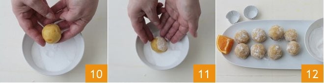 At this point, roll each ball in sugar 10 so that the sugar adheres well to the entire surface 11. As you form the balls, place them on a tray and if you prefer, put them in some pretty colored wrappers, let the almond and orange balls rest for 2-3 hours at room temperature before serving them 12!