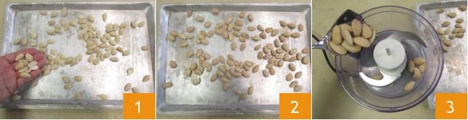To make almond butter, place the peeled almonds on a baking sheet 1, toast them in a preheated convection oven at 370°F for 8 minutes. Once they are warm 2, not completely cooled, pour them into the mixer 3 and set the blades to the lowest speed.