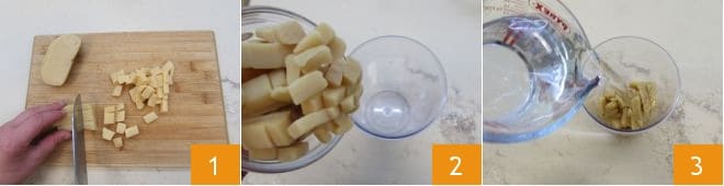 To prepare the almond granita, start by cutting the almond paste into small cubes of equal size 1. Pour them into a tall-sided container 2 and add the water 3.