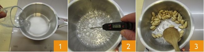 To prepare the almond parfait, start by making the first brittle that will be blended to be poured into the parfait. Pour 20 g of water and 40 g of sugar into a saucepan 1, then let them dissolve over moderate heat until reaching a temperature of 250°F 2. To measure the exact temperature, it is advisable to use a kitchen thermometer, but if you don't have one, you'll notice that the syrup is ready when white bubbles form on the surface. Meanwhile, slightly heat the almonds in the microwave or in a pan but without toasting them, and when the syrup has reached the temperature, pour them inside and stir continuously 3.