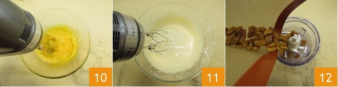 Continue beating 10 until completely cooled: you will obtain a fluffy and frothy mixture 11. At this point, place the now cold caramelized almonds into a blender 12
