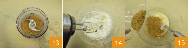 and blend until you get a crumbly mixture 13. Then pour the cream into another bowl and whip it with the mixer (make sure to clean the mixer blades well before whipping the cream) 14. At this point, pour the blended almonds into the pâte à bombe 15, mix