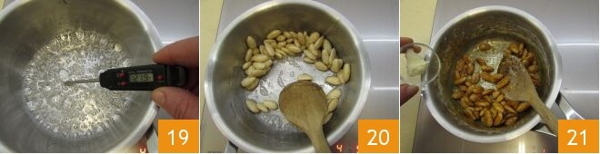 About 30 minutes before serving the parfait, make the brittle for the final decoration. As done previously, make the syrup with water and sugar, bring it to a temperature of 250°F 19, add the almonds slightly heated in the microwave (or pan) 20, and stir until you get a brown color. Finally, add the butter 21 and transfer the almonds onto a silicone mat or a sheet of baking paper.