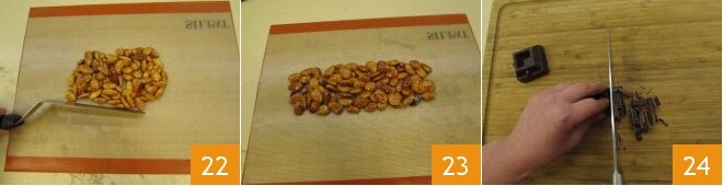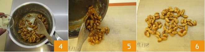 until they turn an amber color. At this point, add the butter 4, which will prevent the almonds from sticking together. Then pour them onto a silicone mat 5 (or a sheet of baking paper), spread them out with a spatula 6 and let them cool completely.
