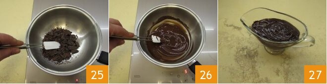 pour it into a bain-marie bowl 25 and melt it over a bain-marie 26. If you prefer, you can do this using the microwave, setting it for 30 seconds at a time and stirring the chocolate each time. Once ready, transfer your chocolate sauce into a sauceboat, making it easier to pour over the parfait!