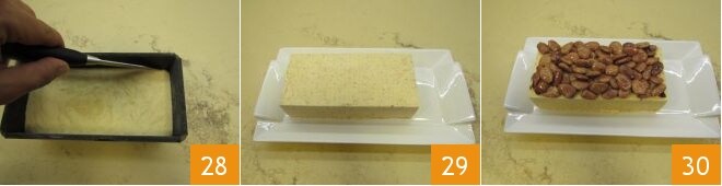 Once the sauce is ready, you should immediately proceed to unmold the almond parfait; to help you, you can immerse the base for a few minutes in boiling water or pass the blade of a small knife all around the inner edge of the mold 28. Invert it onto a serving plate 29, decorate the surface with the almond brittle 30, and serve your parfait accompanied by the chocolate sauce!