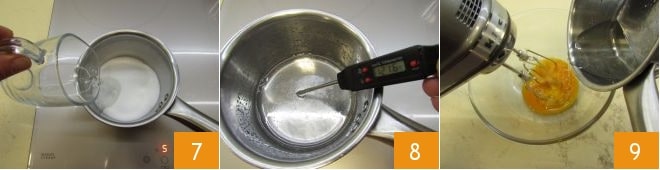 In the meantime, prepare the pâte à bombe which will serve to pasteurize the yolks. Pour the 65 g of sugar together with the 20 g of water into a saucepan 7 and, as done previously, let it simmer until reaching a temperature of 250°F 8. When it reaches around 240°F, start whipping the yolks with an electric mixer, and once the syrup has reached 250°F, pour it slowly into the yolks 9.