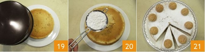Once lukewarm, you can gently remove the pan 19 and when it is completely cool, dust the surface with powdered sugar 20. Finally, decorate your amaretti cake with whole amaretti cookies arranged around the perimeter of the cake 21.