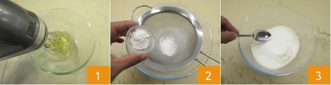 To prepare the amaretti cake, start by ensuring that the ingredients are at room temperature. Separate the eggs (you will need 120 g of egg whites and 80 g of yolks) and beat the egg whites to stiff peaks, then set them aside 1. Proceed by sifting the dry ingredients into a bowl: flour, potato starch, and baking powder 2, then mix the powders with a spoon 3.