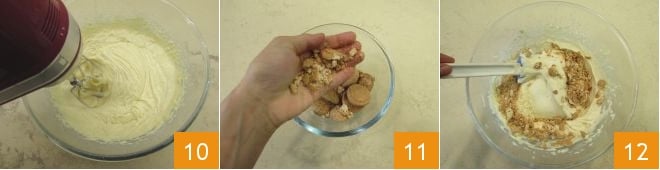 As soon as all the ingredients are combined 10, stop the mixer. In a separate bowl, break the amaretti by hand into coarse crumbs 11, then add them to the mixture. Use a spatula to combine 12.