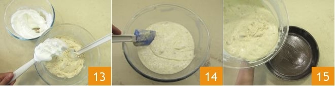Also add the previously beaten egg whites. Pour some and mix to temper the batter 13, then gently fold in the remaining amount with an upward motion. At this point, the mixture is ready 14 to be poured into a 9.5-inch diameter pan already greased (no need to flour it) 15.
