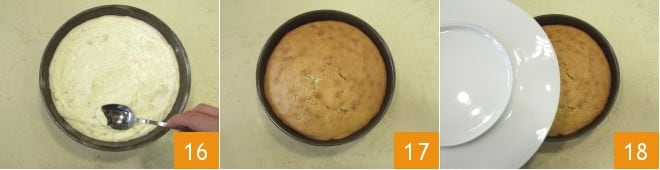 Carefully level the surface with a spoon 16 and bake in a preheated static oven at 392°F for about 35 minutes. Once baked 17, invert the still-warm cake onto a plate 17 and let it cool upside down 18.