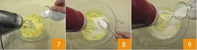 Once they are all combined, you will need to gradually add the rest of the ingredients alternately: a little almond milk 7, some of the previously sifted dry ingredients 8, then a bit more milk 9, and so on, continuing to work the mixture with the mixer to combine everything well.