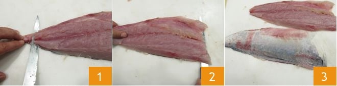 To prepare the amberjack gravlax, since this will not undergo any cooking, it is very important to ensure that it has been flash-frozen at the time of purchase (it is recommended to freeze the fillet for at least 96 hours at 0°F, already skinned, and then thaw it for preparation). Clean the amberjack: remove the skin from the fillet using a very sharp knife, sliding it between the meat and the skin starting from the tail part 1 to the end 2. Once the skin is removed 3