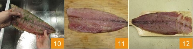At this point, rinse the fillet under running water 10 and dry it with a sheet of kitchen paper. Place the fillet on a cutting board 11 and slice it finely in a sashimi style 12. The amberjack gravlax is ready!